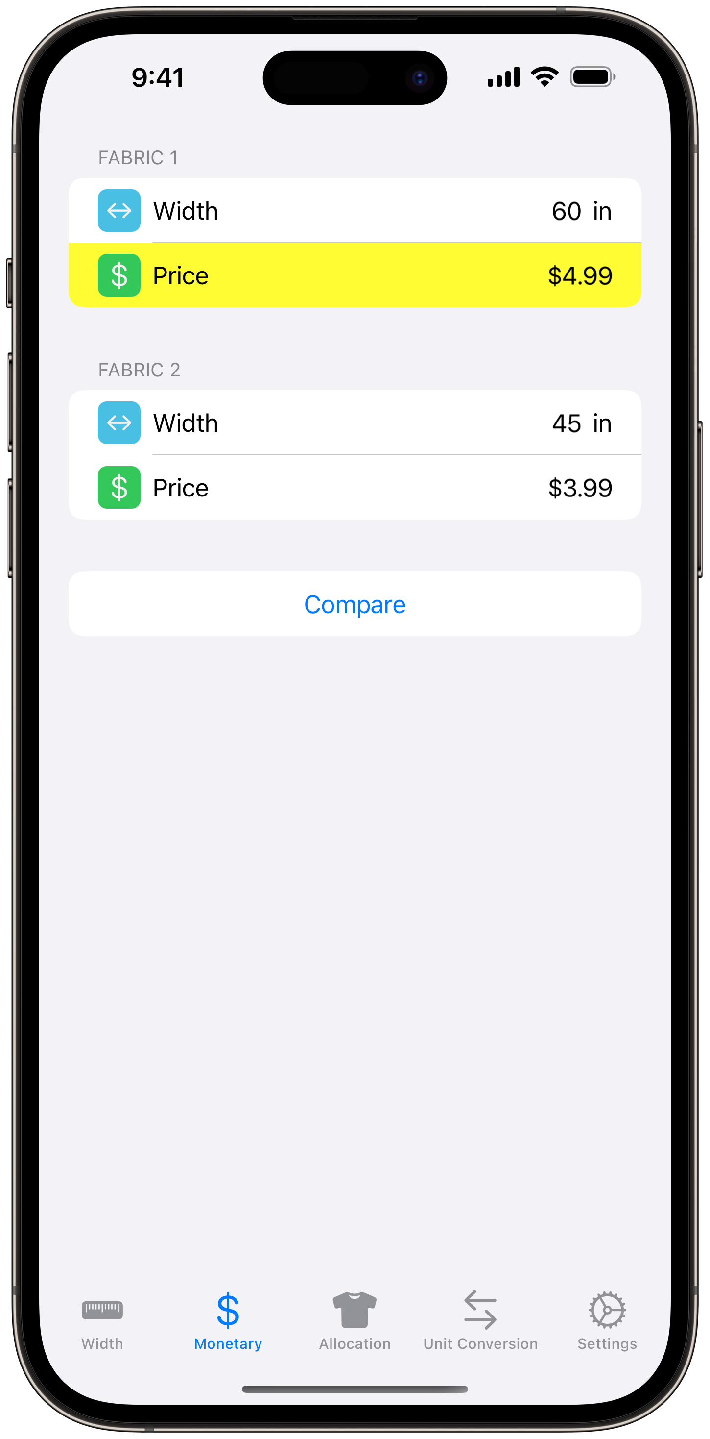 Need to compare the cost of two different width fabrics in inches? Use the Monetary comparison tool in Imperial Mode to calculate which one is the better deal!